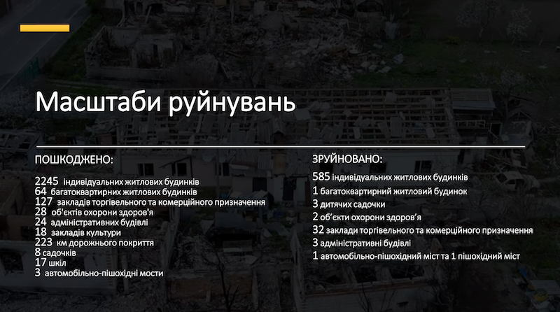 As a result of this bloody destructive 4 weeks, Makariv had lost 40% of its houses and infrastructure. Not a single administrative building was left undamaged. Most of its residents were able to evacuate. Tragically, 132 local citizens were executed by the russian murderers. Click HERE to watch a 2 minute video showing the town of Makariv before and after the invasion.